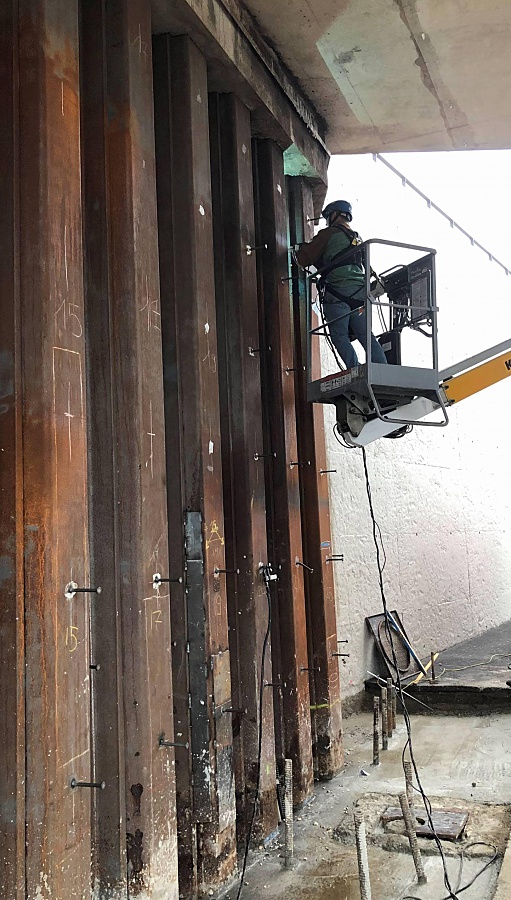 Mise en œuvre de goujons connecteurs sur un rideau de palplanches sous ouvrage